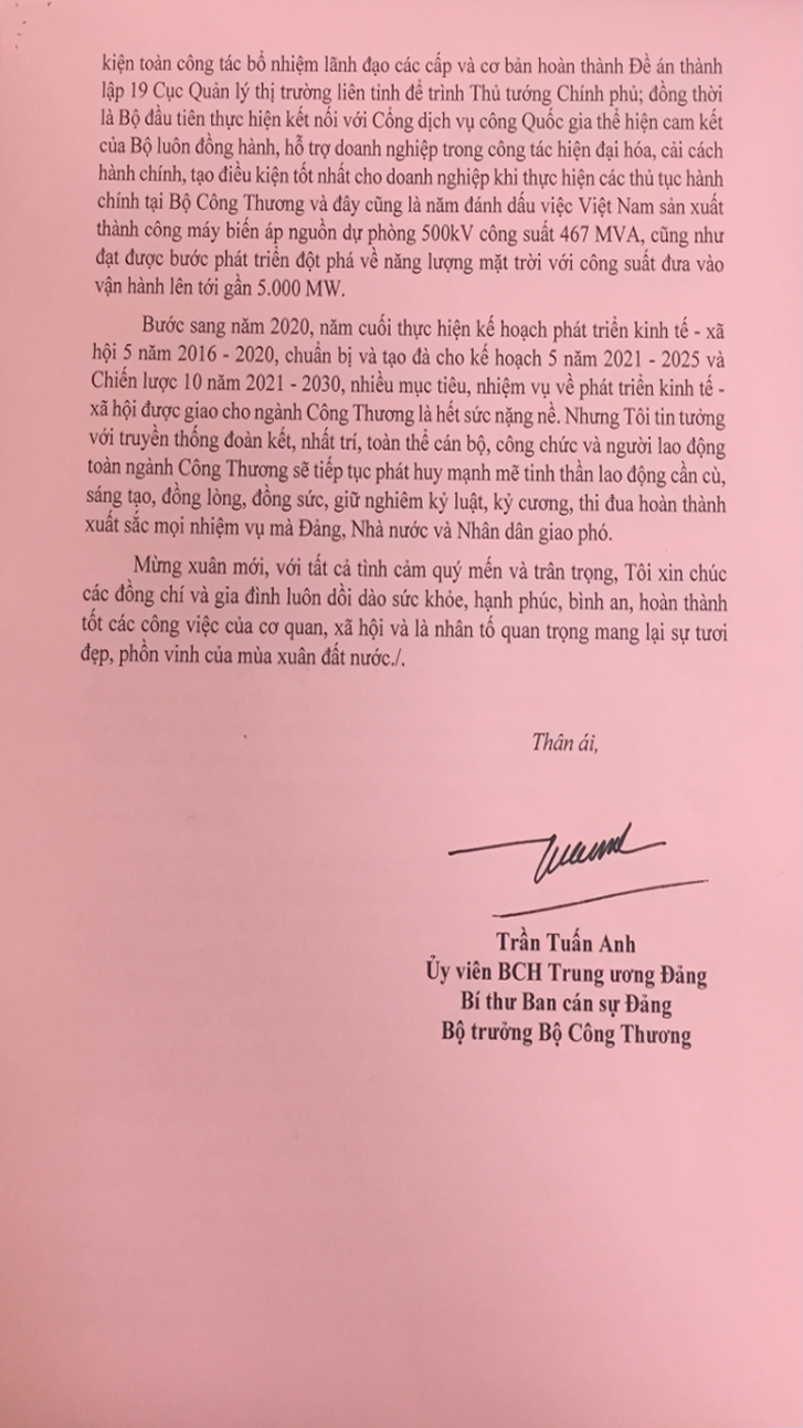 Nhân dịp đón Xuân Canh Tý 2020, thay mặt Ban cán sự Đảng, Lãnh đạo Bộ Công Thương và nhân danh cá nhân, Bộ trưởng Trần Tuấn Anh gửi đến các cán bộ lão thành, công chức, viên chức, người lao động và học sinh, sinh viên đang học tập tại các cơ sở đào tạo trong ngành Công Thương cùng gia đình lời chúc mừng năm mới tốt đẹp nhất.