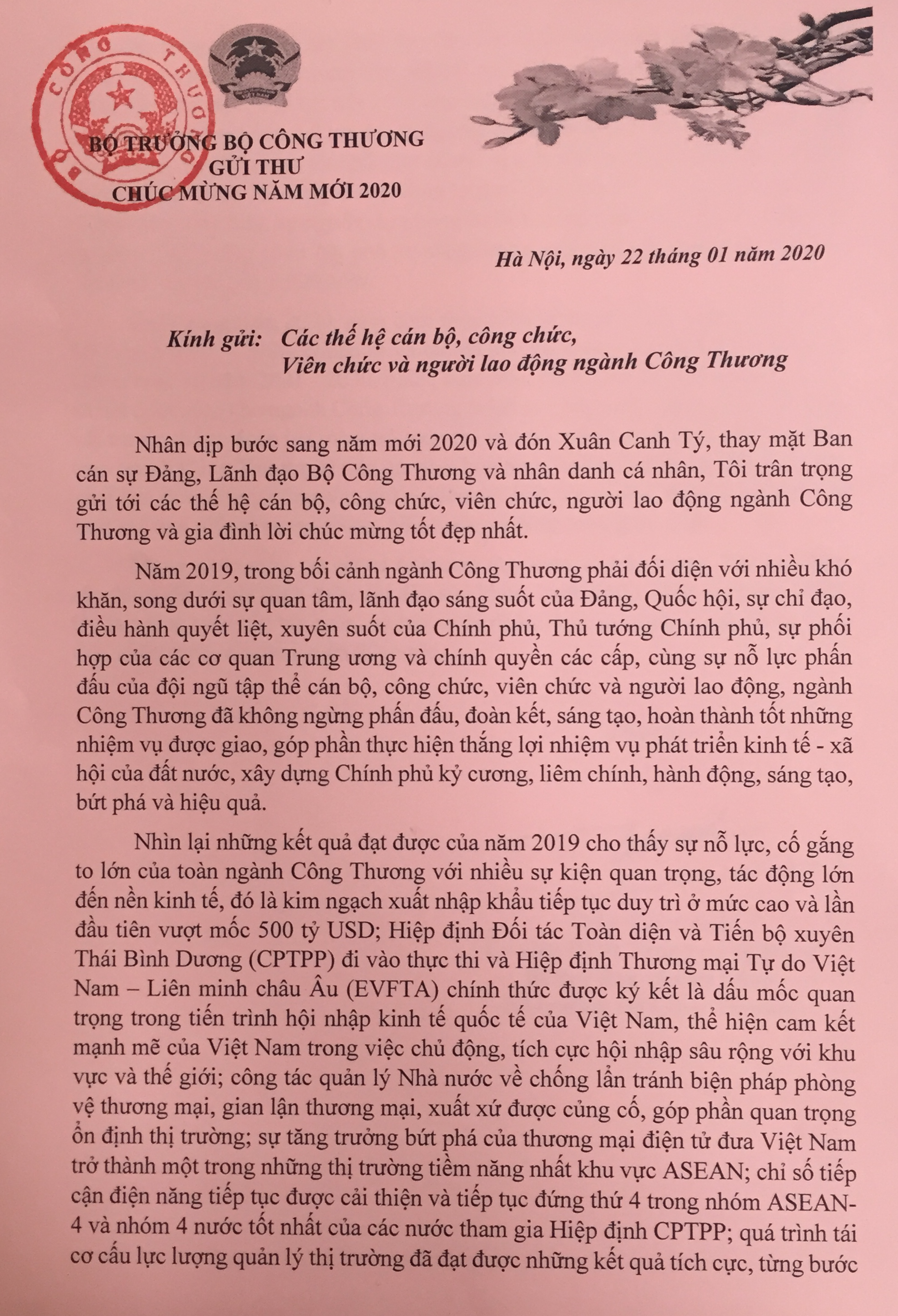 Bộ trưởng Bộ Công Thương gửi Thư chúc Tết các cán bộ Ngành Công Thương