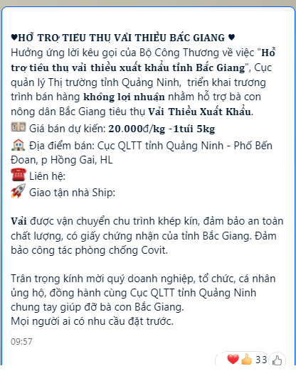 Sáng ngày 08/6/2021, Cục Quản lý thị trường tỉnh Quảng Ninh đã nhận bàn giao từ Bưu điện tỉnh Quảng Ninh 02 tấn vải thiều Bắc Giang đầu tiên thuộc Kế hoạch hỗ trợ người dân Bắc Giang tiêu thụ 3000tấn vải thiều của Tổng cục Quản lý thị trường - Bộ Công Thương.