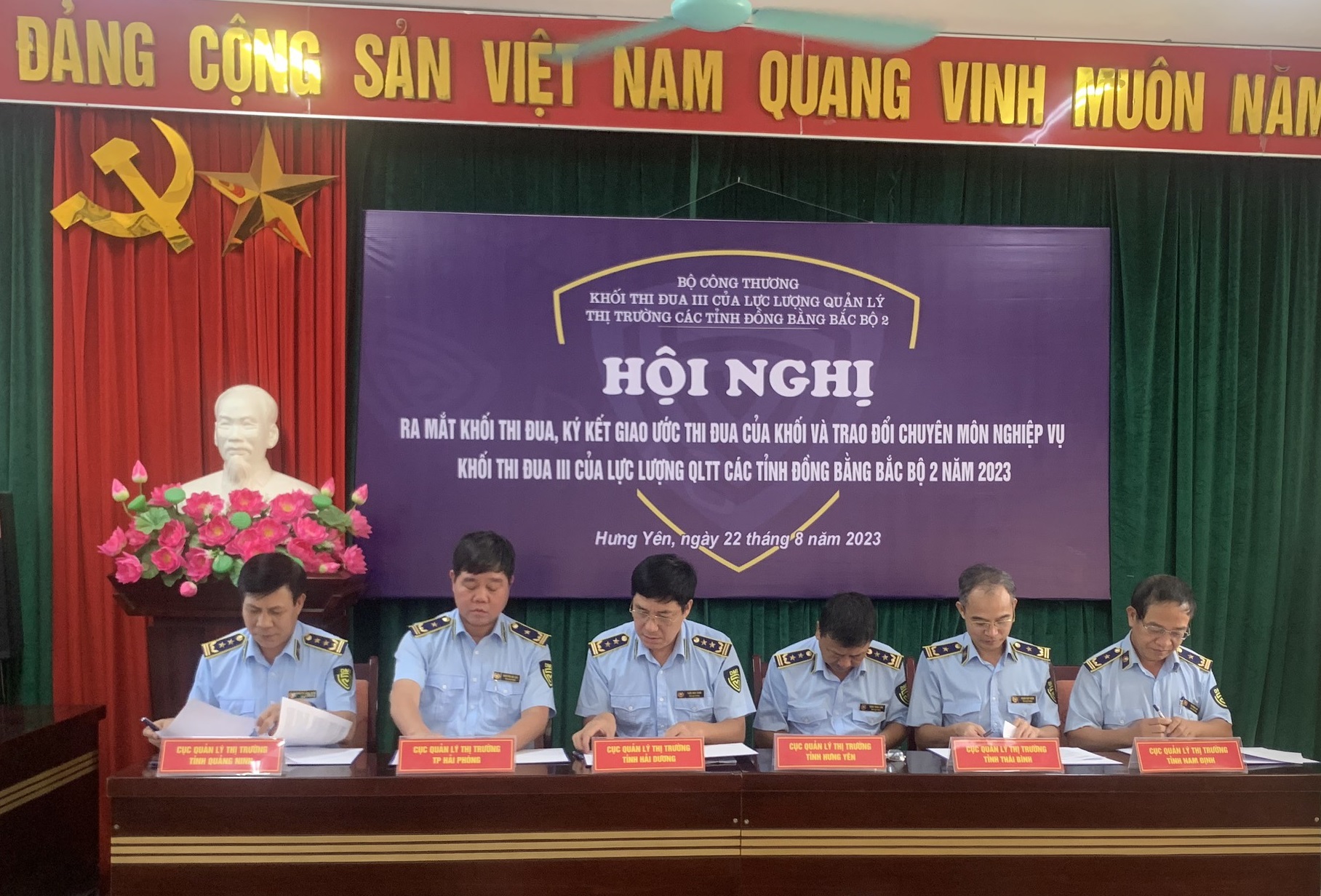 Thực hiện các Quyết định của Bộ Công thương về phân chia Khối thi đua của lực lượng Quản lý thị trường; Công nhận Khối trưởng, Khối phó các Khối thi đua của lực lượng Quản lý thị trường và văn bản hướng dẫn tổ chức hoạt động, đánh giá, bình xét thi đua của các Khối thi đua của lực lượng Quản lý thị trường. Được sự nhất trí của Tổng cục QLTT, hôm nay, Cục Quản lý thị trường tỉnh Hưng Yên - Đơn vị Khối trưởng Khối thi đua III chủ trì tổ chức Hội nghị ra mắt Khối thi đua III và ký kết giao ước thi đua năm 2023.