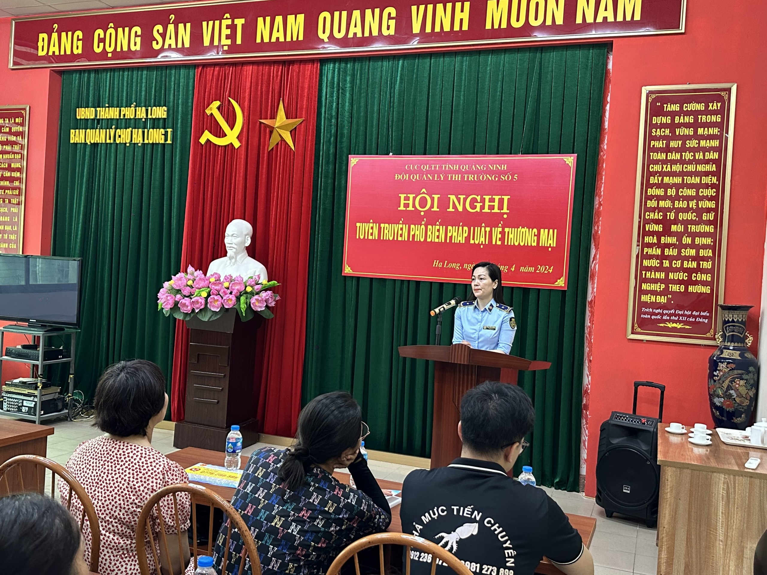 Thực hiện Nghị quyết của Ban Chấp hành Đảng bộ Cục về lãnh đạo công tác tuyên truyền, phổ biến pháp luật thương mại cho các tổ chức, cá nhân sản xuất, kinh doanh trên địa bàn tỉnh và Kế hoạch số 104/KH-QLTTQN ngày 23/01/2024 của Cục QLTT tỉnh về tuyên truyền phổ biến pháp luật trong hoạt động kinh doanh thương mại; ngày 19 tháng 4 năm 2024, Đội Quản lý thị trường số 5 phối hợp với Ban Quản lý Chợ Hạ Long và Trung tâm thương mại Vincom Plaza Hạ Long tổ chức Hội nghị tuyên truyền, phổ biến pháp luật và phát tờ rơi cho 470 đại biểu đại diện cho các tổ chức, các nhân và hộ kinh doanh tại Chợ Hạ Long 1 (400 đại biểu) và Trung tâm thương mại Vincom Plaza Hạ Long (70 đại biểu).