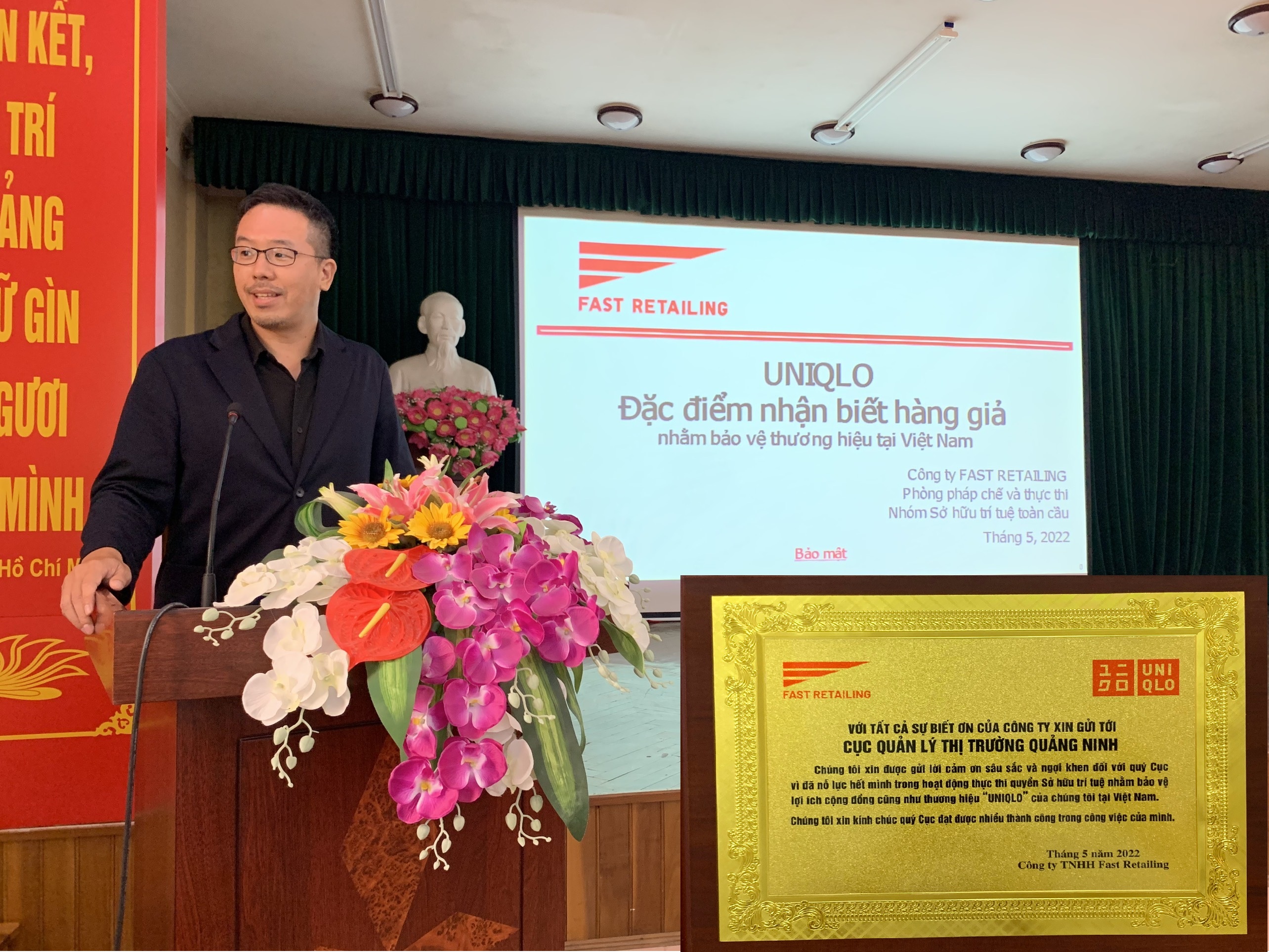 Cũng trong dịp này, Ông Kiyohiro Nakamura - Trưởng nhóm sở hữu trí tuệ của tập đoàn Fast Retailing đến từ Nhật Bản đã gửi lời cảm ơn sâu sắc đối với Cục Quản lý thị trường tỉnh Quảng Ninh trong việc bảo vệ lợi ích cộng đồng cũng như thương hiệu UNIQLO do tập đoàn sở hữu. Đồng thời ông cũng thay mặt tập đoàn trao bảng vàng cảm ơn tới Cục Quản lý thị trường tỉnh Quảng Ninh.