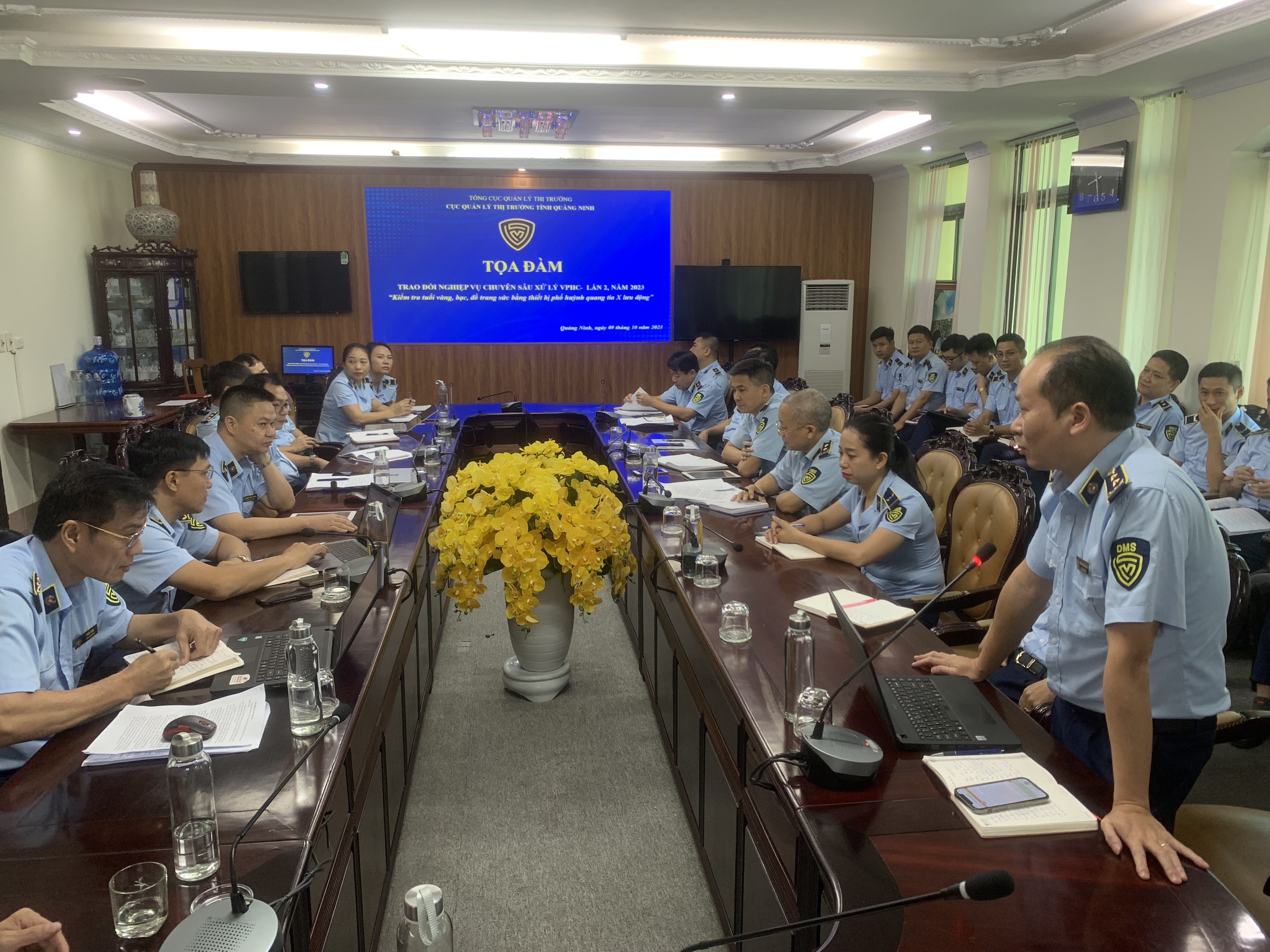 Ngày 09/10/2023, Cục Quản lý thị trường tỉnh Quảng Ninh đã tổ chức buổi tọa đàm chuyên sâu nghiệp vụ Quản lý thị trường. Tham dự buổi tọa đàm có các đồng chí Lãnh đạo cục, lãnh đạo các phòng chuyên môn, Đội QLTT và công chức có kinh nghiệm trong công tác kiểm tra xử lý vi phạm hành chính. Tại buổi tọa đàm, các đại biểu đã cùng nhau trao đổi, chia sẻ kinh nghiệm và thảo luận chuyên sâu về nghiệp vụ QLTT trong quá trình thực thi công vụ. Tới dự và tham gia buổi tọa đàm có đồng chí Kiều Dương – Vụ trưởng vụ Thanh tra pháp chế, Tổng cục Quản lý thị trường.